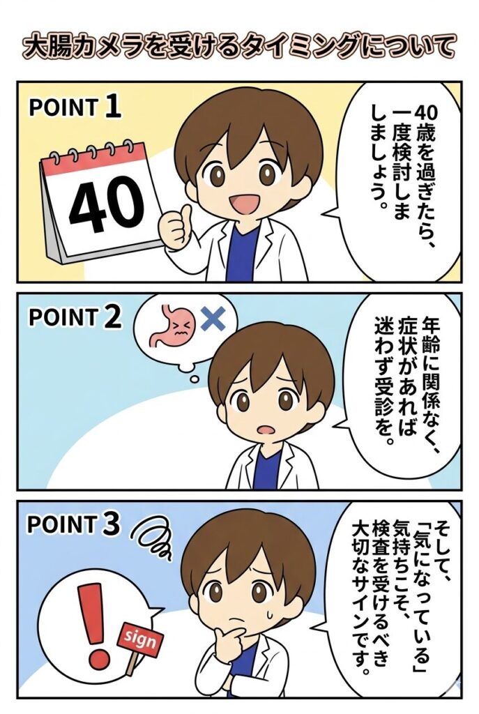 今回は、大腸カメラを受けるタイミングについて、患者さんの視点で分かりやすくお話しします。