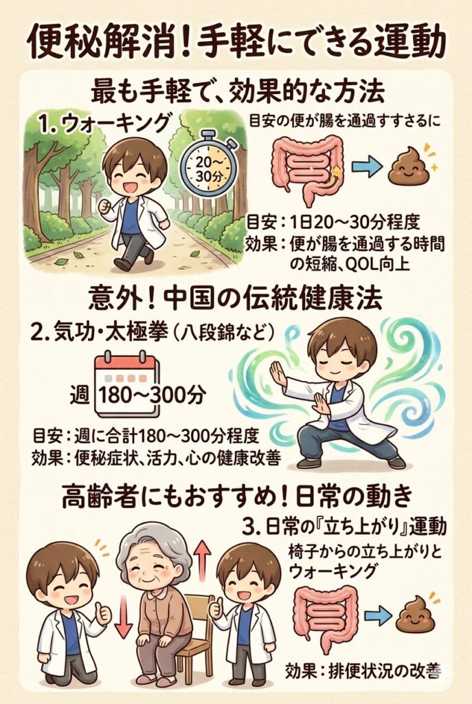 - 特に「有酸素運動」が効果的:ウォーキングや気功などの有酸素運動は、便秘改善にポジティブな影響を与えます 。