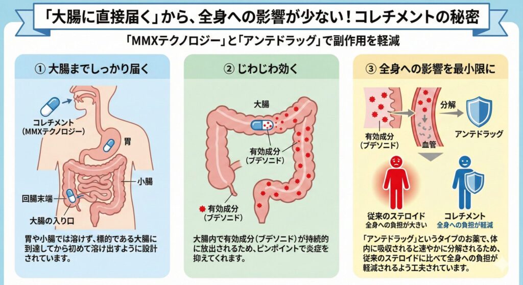 - じわじわ効く: 大腸内で有効成分(ブデソニド)が持続的に放出されるため、ピンポイントで炎症を抑えてくれます 。
