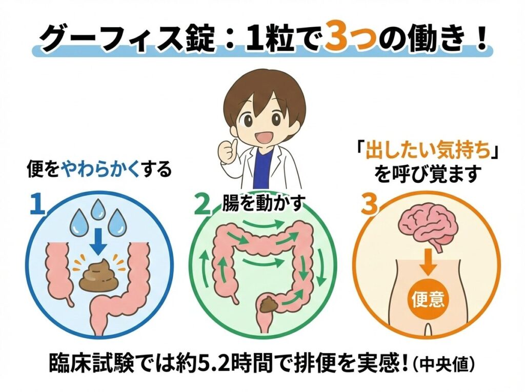 臨床試験の結果では、服用した多くの方が約5.2時間(中央値)で最初の排便を実感されており、プラセボ(偽薬)に比べて有意に早い効果が確認されています。