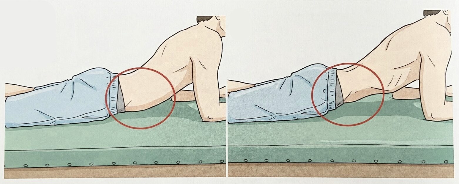 右図:左図の状態から、腹式呼吸で息を吐き下腹部を引き上げた状態にし、その状態を保持。