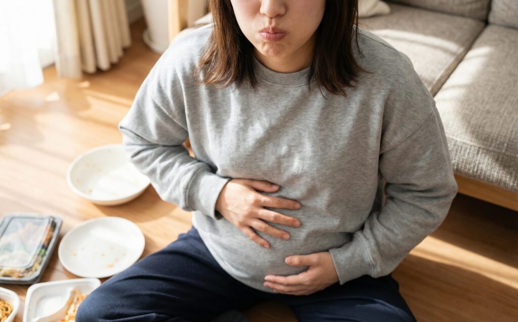 お腹の中にガスが溜まったり、腸の動きが乱れたりすることで、お腹が膨らんだような圧迫感・パンパンになった感覚がある状態です。