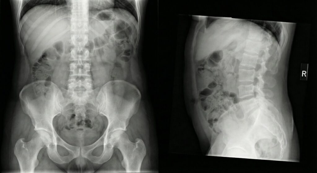 ・腹部X線検査:腸管が拡張しているかどうかをみます。